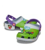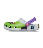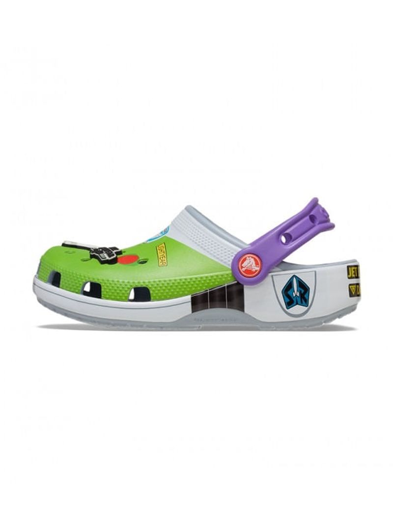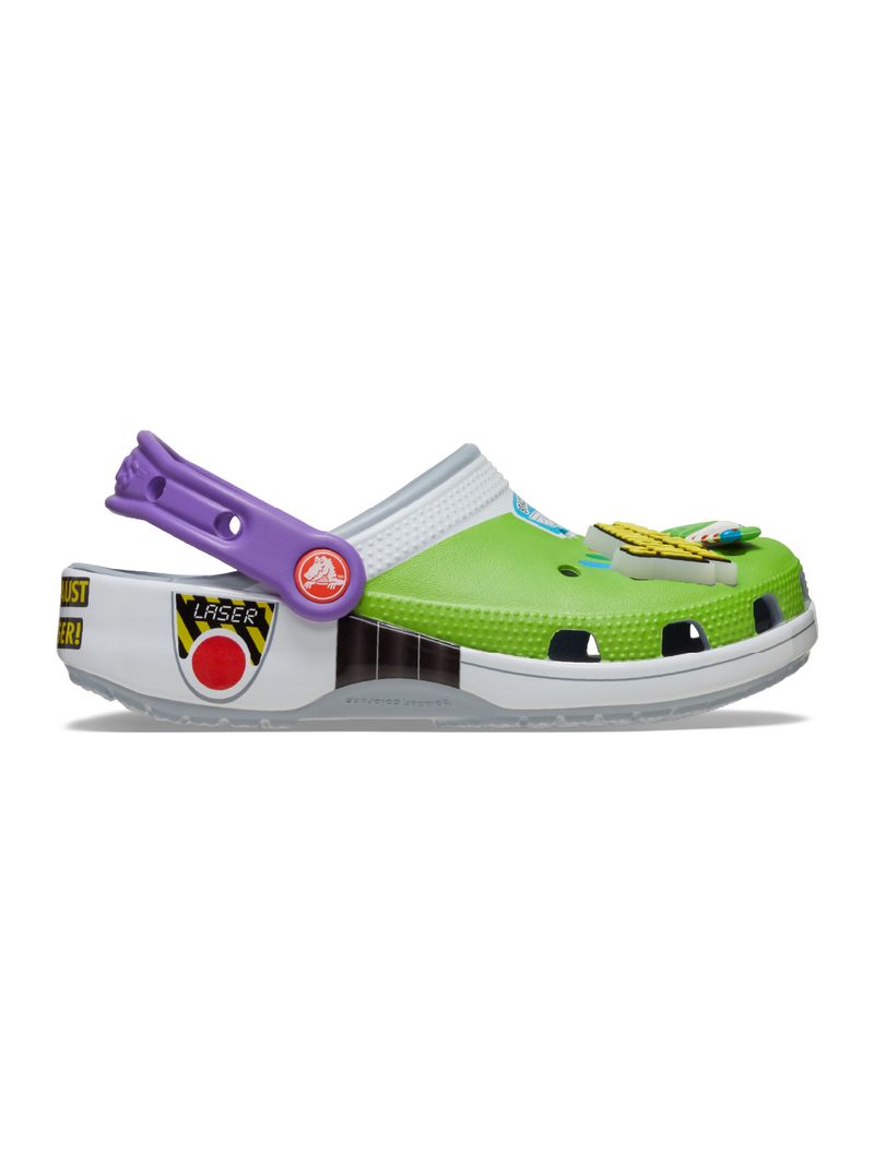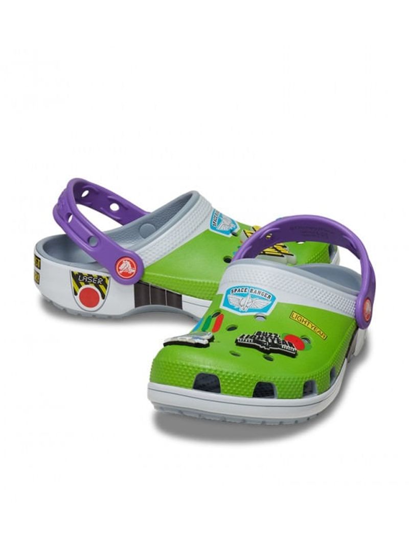 ¡Atención Star Command! El exclusivo Zueco Buzz Classic se ha estrellado en un planeta extraño. Este estilo de edición limitada presenta un diseño de estampado totalmente envolvente inspirado en el icónico disfraz de Space Ranger, que incluye cuatro exclusivos adornos Jibbitz™. Estos zuecos también presentan la querida firma "Andy" en la suela interior.