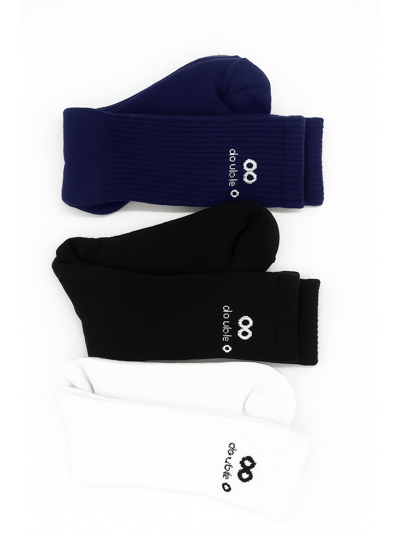 Medias altas , paquete de tres medias, azul marino, blanco, negro. 82% COTTON + 9% NYLON + 1% ELASTANO + 3% OTROS