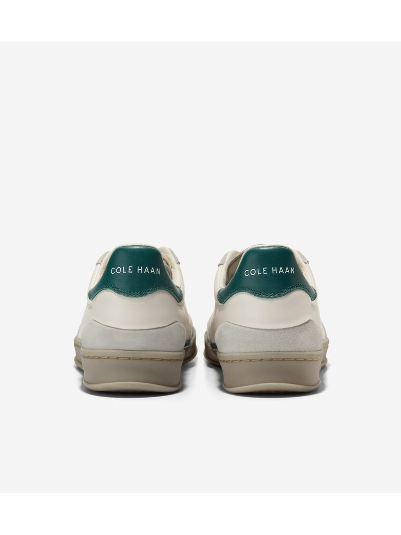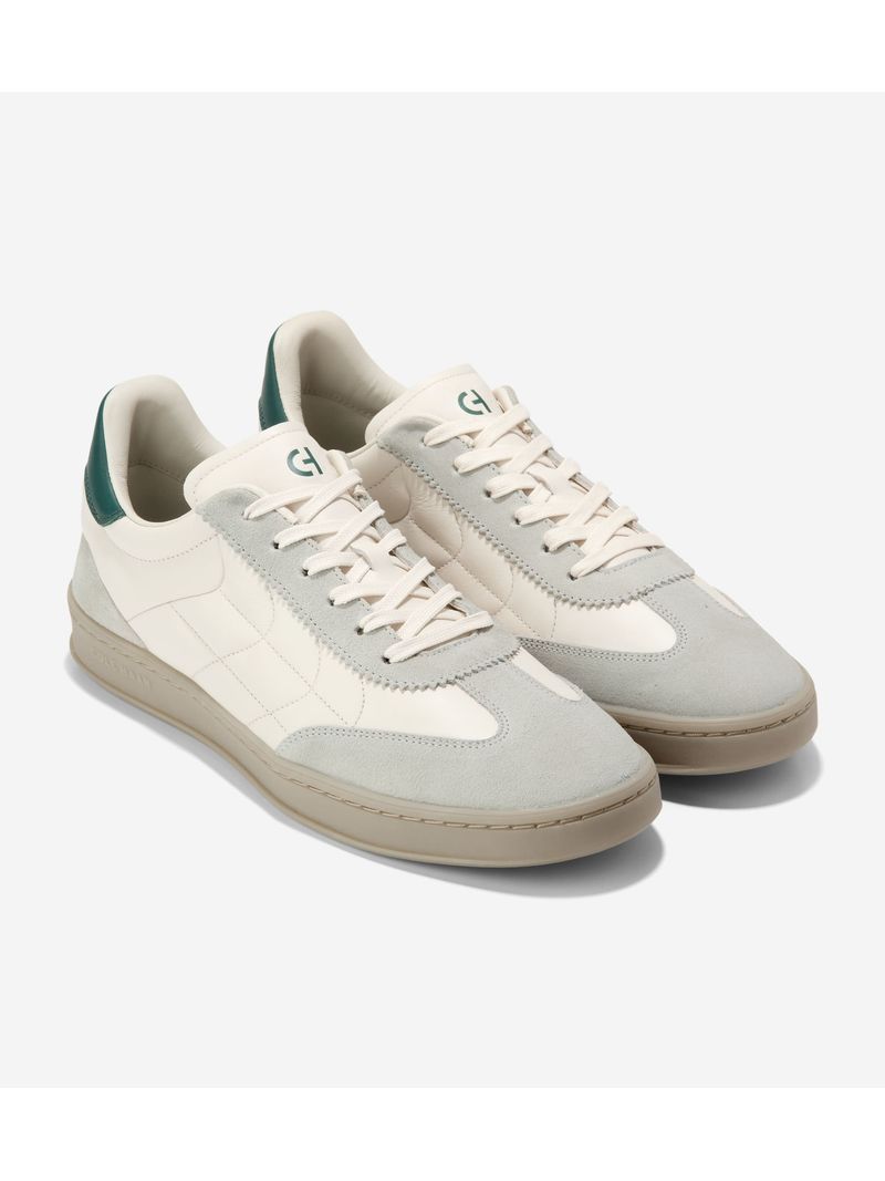 Parte superior de cuero en Marfil con capa de gamuza en Glacier Grey, refuerzo del talón en Rain Forest; sistema de cordones con seis ojales. Suela cupsuela de goma, con patrón de tracción inspirado en el fútbol, en Natural Gum. Plantilla acolchada GRANDFØAM